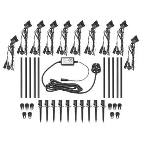 10 light LED spike kit in textured black finish that offers a stylish lighting solution to any outdoor area. Can also be wall-mounted. 1.5m cable length from head to head. Supplied with 5m extension cable.