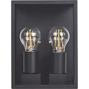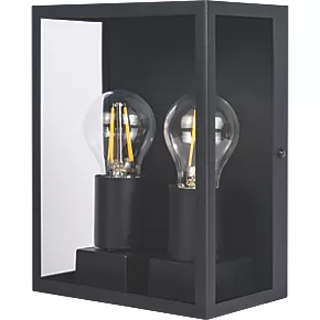 Modern flush-mounted wall lantern in black with glass panels. Twin E27 lampholders, ideal for LED filament lamps.