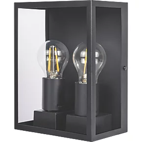 Modern flush-mounted wall lantern in slate grey with glass panels. Twin E27 lampholders, ideal for LED filament lamps.